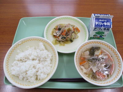 麦ごはん、牛乳、じゃがいもの味噌汁、いわしのしょうが煮野菜の二色和え