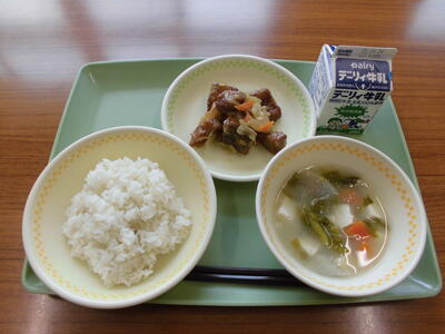 麦ごはん、牛乳、チンゲンサイのスープ、回鍋肉