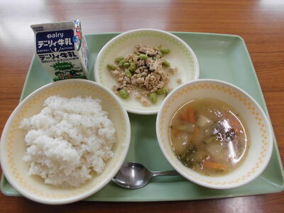 麦ごはん、牛乳、中華スープ、鶏そぼろ丼