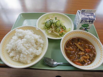 麦ごはん、牛乳、米粉のチキンカレー、フレンチサラダ