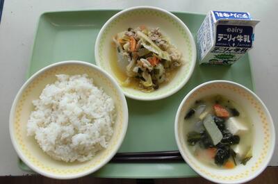 麦ごはん、牛乳、小松菜のみそ汁、豚肉ときのこのしょうが焼き