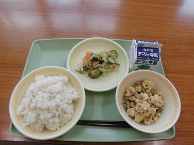 麦ごはん、牛乳、炒り豆腐、甘酢和え