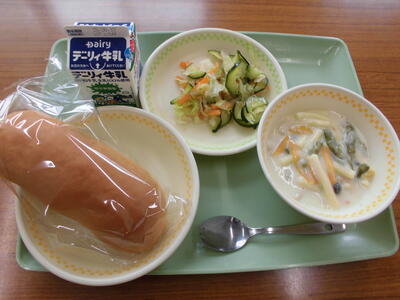 コッペパン、牛乳、アスパラのクリーム煮、ズッキーニのサラダ