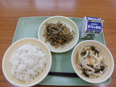 減量むぎご飯、牛乳、わかめうどん、きんぴらごぼう