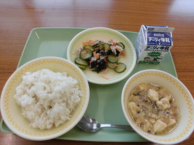 麦ごはん、牛乳、麻婆豆腐、中華サラダ