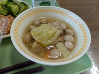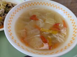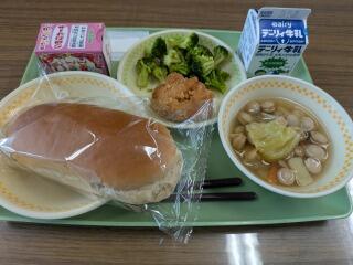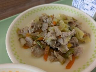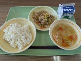 今日は、麦ご飯、カラフル野菜スープ、豚焼肉炒め、牛乳です。