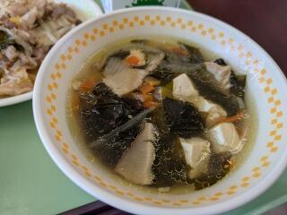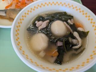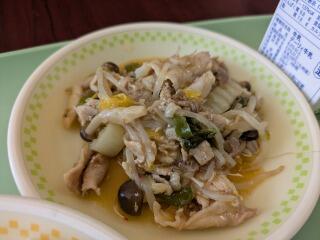今日は、麦ご飯、わかめスープ、豚キムチ丼、牛乳です。