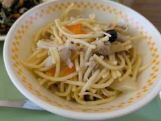 メニューは、減量麦ご飯、キノコうどん、千切り大根のツナ和え、牛乳でした。