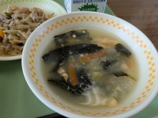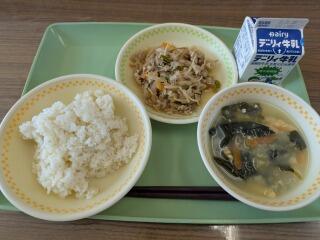 メニューは、麦ご飯、かき玉汁、豚肉のソース炒め、牛乳でした。