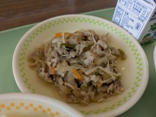 メニューは、麦ご飯、汁ビーフン、国富野菜炒め、牛乳でした。