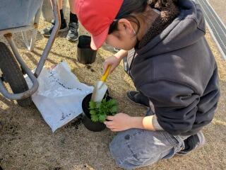 卒業式シーズンに向けて、花を育てる計画です。森永小は児童数も少ないので、一人三鉢つくります。今日は、6年生がふかふかの土を鉢に入れ、苗を植えていました。元気に育って、花をつけると良いですね。