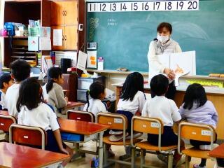 1年生の教室では担任の先生による読み聞かせ。大好きなカレーライスの仕掛け絵本や大谷翔平選手の本などに、目を輝かせて聞いていました。