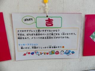 掲示板の「で」のカードをめくってみると・・・「吉」「スマホやタブレット使いすぎてないかな?時計を見てメリハリのある行動をしよう。ラッキーアクションは外遊び」でした。