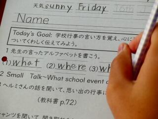 子ども達は修学旅行(school trip)と書き、しっかりと発音できているかアビー先生に確認してもらっていました。