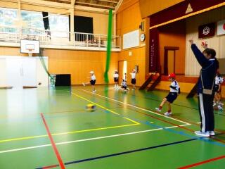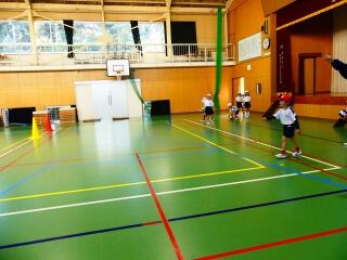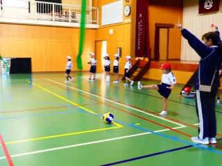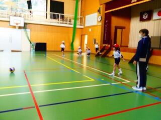 1年生は、体育館でボールを蹴る運動に親しんでいました。