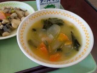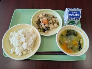 今日は、麦ご飯、青梗菜のスープ、鶏肉とサツマイモの中華炒め、牛乳でした。