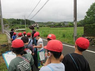 3年生の社会科の学習です。学校の周りの様子を見学して回りました。郵便局やお店、畑など、今一度見ると、再発見がありました。