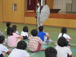 6月の全校朝会では、雨の日の登下校の安全について、担当の先生からお話がありました。続いて、6年の河村彩花さんと4年の友花さん姉妹が、自転車競技で好成績を修め表彰されました。
