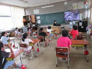 毎朝、各家庭と登校時の検温、換気を実施しながらの0エアコン使用、活動場面ごとの手指消毒など、新型コロナウイルス感染予防と熱中症対策を行いながらの学校生活です。始業式は各教室をオンラインでつないで、代表児童による作文発表もご覧のとおり行いました。