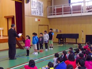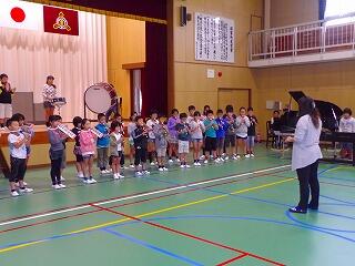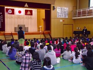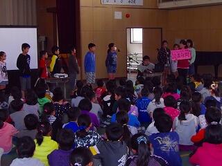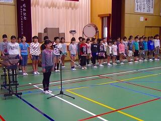 11月10日の朝の活動の時間に音楽集会があり、3・4年生が郡の音楽大会で発表する合唱と合奏を全校児童の前で披露しました。