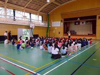 6月の初めから行っていた体育館の改装工事が終了し、ふれ合い児童集会の時間に児童への初お披露目がありました。