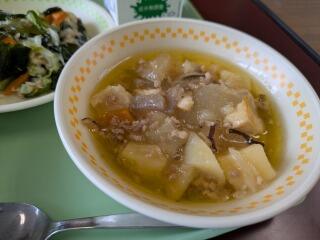 冬瓜は冬の野菜!?と思っていましたが、給食時の放送で「冬瓜は、冬に瓜と書きますが、夏の野菜です。夏に収穫され冬まで保管でき冬にも食べられることからその名前がついたそうです。」とありました。