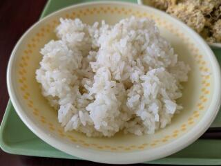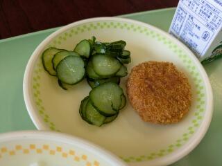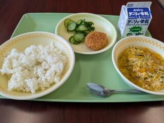 メニューは、鶏飯(麦ご飯)、彩り野菜のミンチカツ、添きゅうり、牛乳でした。