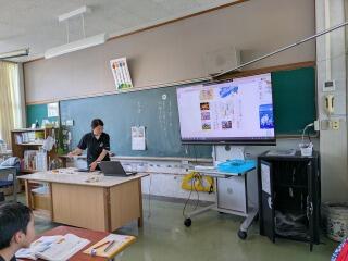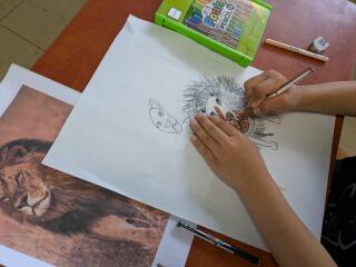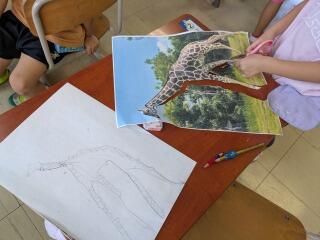 1年生教室では、自分の描きたい動物の写真を見ながら描いていました。