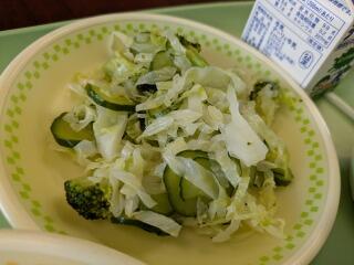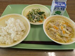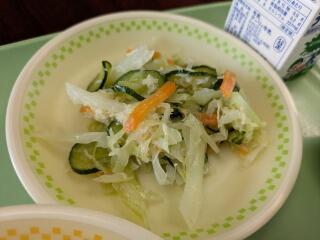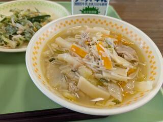 メニューは、麦ご飯、汁ビーフン、棒々鶏サラダ、牛乳でした。