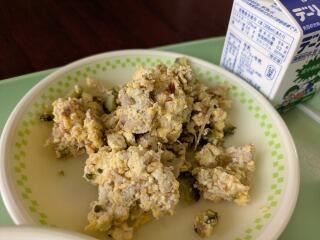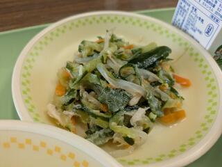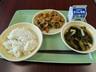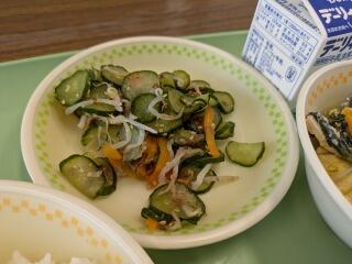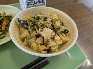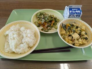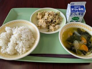 メニューは、麦ご飯、高野豆腐の卵とじ、胡瓜の土佐酢和え、牛乳でした。