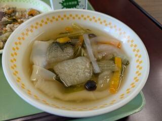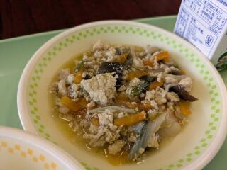メニューは、麦ご飯、和風ワンタンスープ、茄子のそぼろ炒め、牛乳でした。