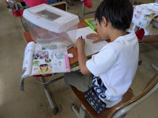 【生き物大好き】の単元で、自分が持ってきた生き物を観察しながらスケッチしていました。