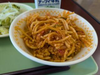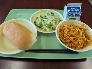 メニューは、ミニコッペパン、夏野菜のミートソーススパゲティ、ブロッコリーサラダ、牛乳でした。