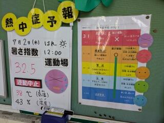 定刻に熱中症指数を計測していますが、朝から指数が高い日もあり、外での活動が制限されたり、遊べなかったりする日も続いています。