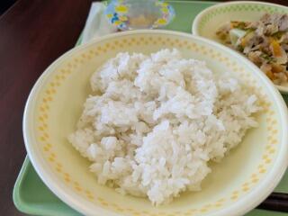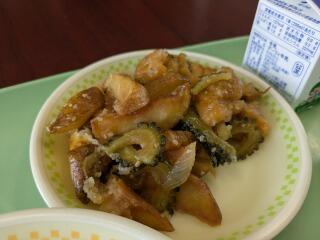 メニューは、麦ご飯、カボチャの味噌汁、ゴーヤチャンプルー、牛乳でした。