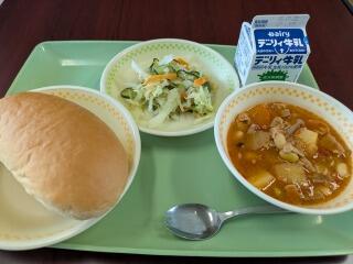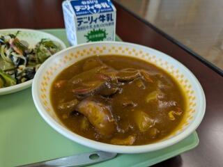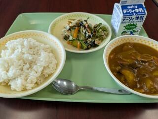 メニューは、麦ご飯、米粉の夏野菜カレー、海藻サラダ、牛乳でした。
