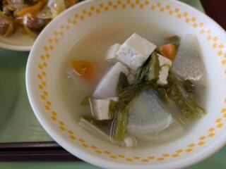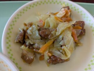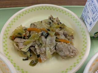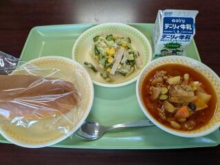 今日のメニューは、「ポークビーンズ、黒糖パン、グリーンサラダ、牛乳」よく煮込まれたビーンズにふんわり甘い黒糖パン、さっぱり味のサラダ。どれも美味でした。