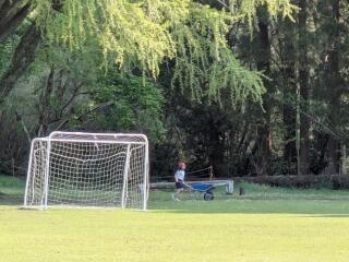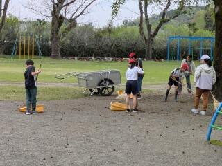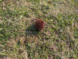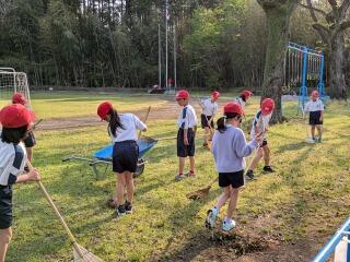 今朝も、運動場で落ち葉や通称「ミートボール」集めに励んでいました。