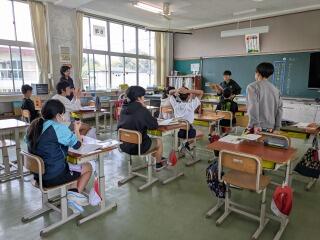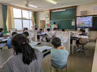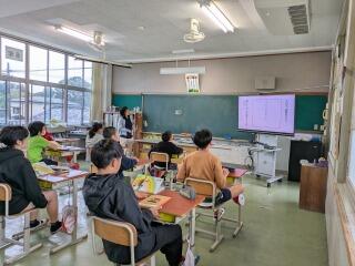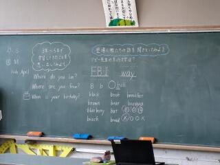 6年教室に入ると、「伝わるかな、好きな食べ物」の導入として、一人が好きな食べ物のヒントをいくつか出し、みんなで当てるという内容をやっていました。