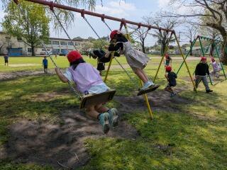 森永公園は、桜が綺麗に咲いている場所もあり、ぽかぽか陽気の中6年生と一緒に楽しく遊びました。