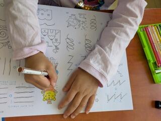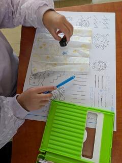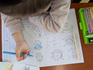 ゆっくりゆっくり線をたどる子、先生から教えられたとおりに色塗りをする子・・・。