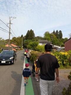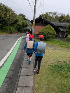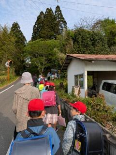 全部で18班ある登校班ですが、一番人数が多い森永地区、竹田地区、そして向高地区の子ども達は、車の通りも多い中歩いてきます。