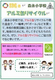 〈空き缶のリサイクル〉地域の皆様にアルミ缶リサイクルを呼びかけるちらしを作成し、地区回覧に入れてもらいました。子供達の役に立ててほしいと、学校へもってきてくださる方々のおかげで、学校にはたくさん集まっています。リサイクルに出した益金で、ボールを購入しました。子供達は体育の時間や休み時間に喜んで活用しています。また、リサイクルの心も育っています。