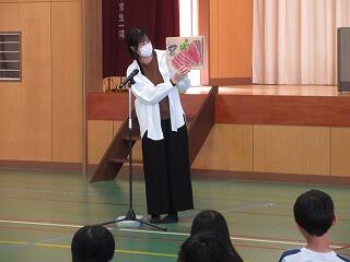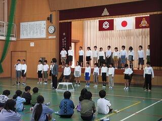 11月1日(水)の全校朝会は、「音楽大会(3・4年生参加)の校内発表」と「図書担当の武村先生による読書のすすめ」をしました。上手な歌声にみんなうっとりしました。また、読書の話に聞き入る子供達でした。
