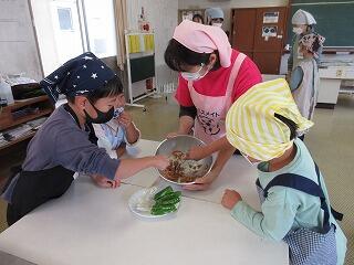 11月17日(金)2年生の食育はピーマンの調理が行われました。2年生の子供達は朝からエプロンに手を通し、この授業を今か、今かと待っていました。食生活改善推進委員の皆様のお手伝いを受け、おいしくできました。