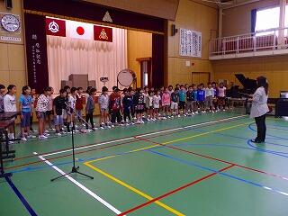 6月の初めから行っていた体育館の改装工事が終了し、ふれ合い児童集会の時間に児童への初お披露目がありました。