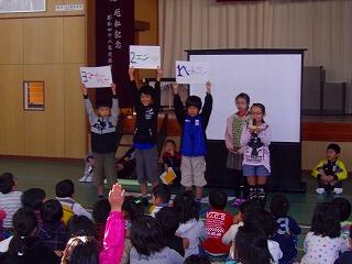 11月10日の朝の活動の時間に音楽集会があり、3・4年生が郡の音楽大会で発表する合唱と合奏を全校児童の前で披露しました。
