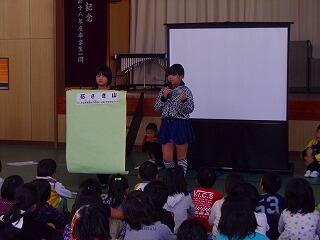 読書集会では、図書委員会の児童が読み聞かせやクイズ、読書旬間の取組の紹介をしました。
