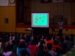 その後、柴田栄養教諭から朝ごはんについての話があり、子ども達は真剣に聞いていました。