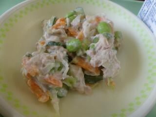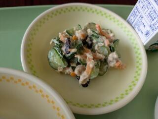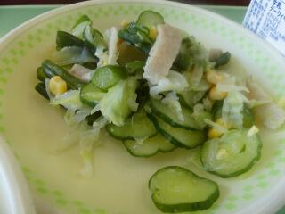 グリーンサラダには、きゅうりやいんげん、ハムが入っていました。野菜がみずみずしく、夏らしさを感じました。